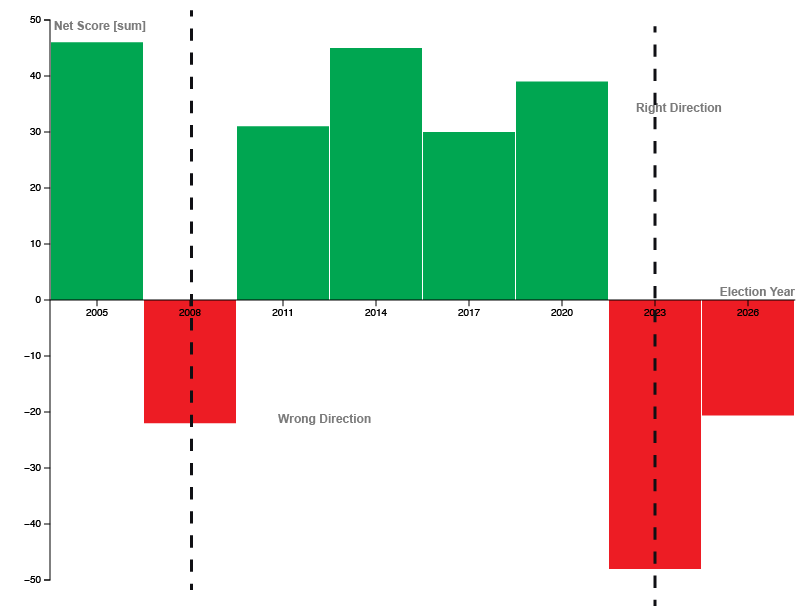 Chart 2: Right/Wrong direction. Dotted line is change of government