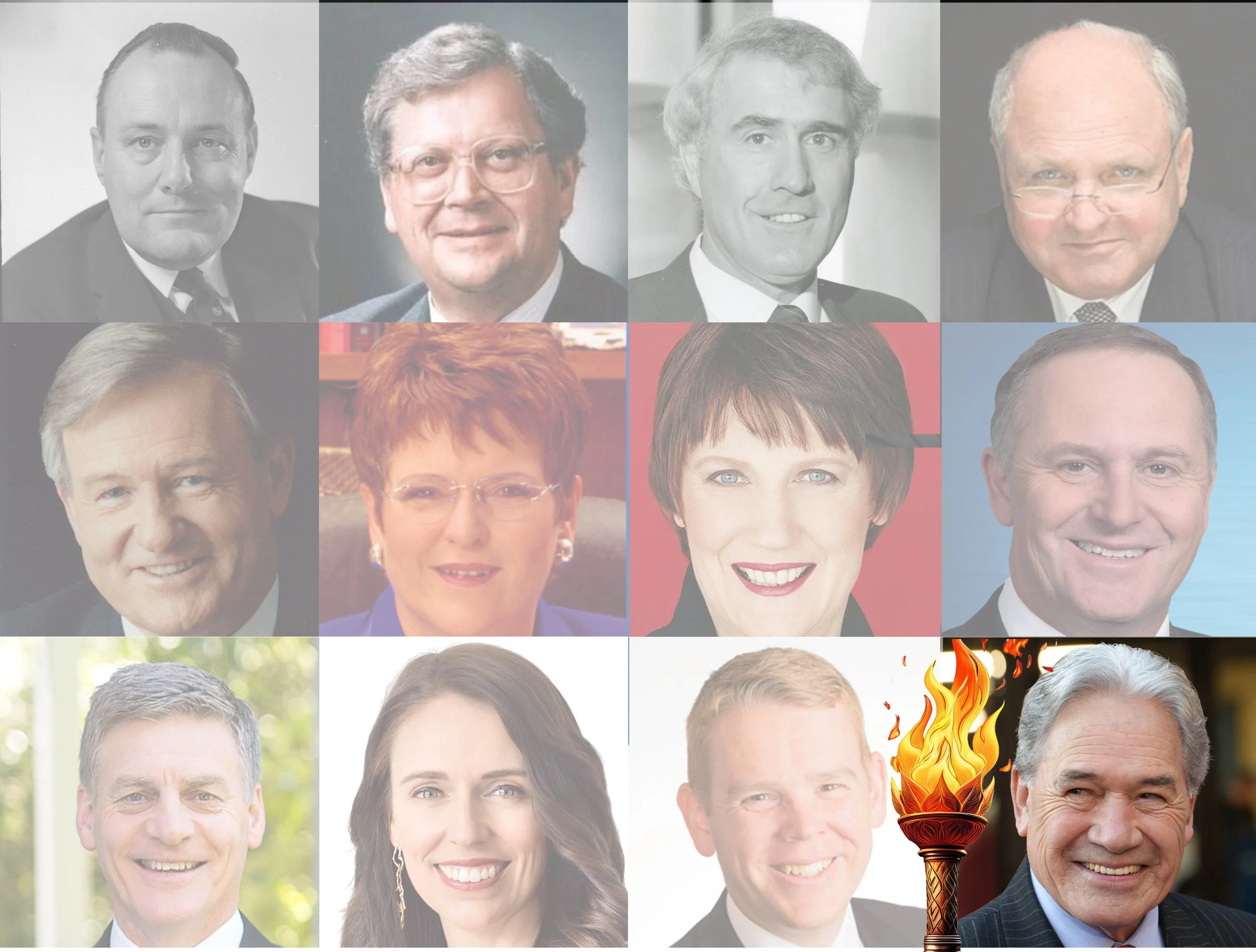 It has been 51 years since Winston Peters first contested Northern Māori in 1975. He has seen the back of eleven Prime Ministers: From top left to bottom right, Muldoon, Lange, Palmer, Moore, Bolger, Shipley, Clark, Key, English, Ardern, Hipkins.